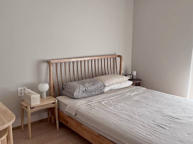 구석에 있는 협탁은 예전부터 사용하던 거라 처분하고 새로 사고 싶은데, 맘에 드는 협탁을 아직 못 찾기도 했고 게으름 때문에 미루고 있어요. ㅎㅎ 침구 구매도 덩달아 미루고 있는데 이 사진을 보니까 얼른 폭닥폭닥 예쁜 침구를 사야겠다는 생각이 드네요 :-)
