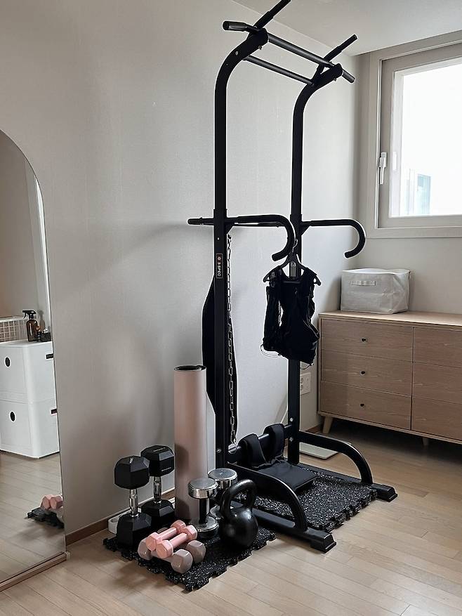 드레스룸 한쪽에는 이렇게 운동기구들을 배치해두었어요. 남편은 혼자 살 때도 운동기구를 집에 둘 만큼 오래전부터 운동이 습관화되어 있어서 편하게 운동할 수 있는 공간을 만들어 주고 싶었어요. 그리고 저도 5년 전 요가를 배우면서 홈트레이닝을 꾸준히 해오고 있어서 저희만의 운동 공간이 있다는 게 너무 좋아요!