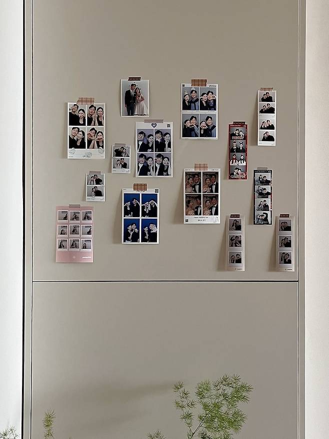 밋밋했던 수납장 문에는 거울을 달까 고민하다가 여닫을 때 불편함이 있을 것 같아서 저희의 추억을 기록해두고 있어요.