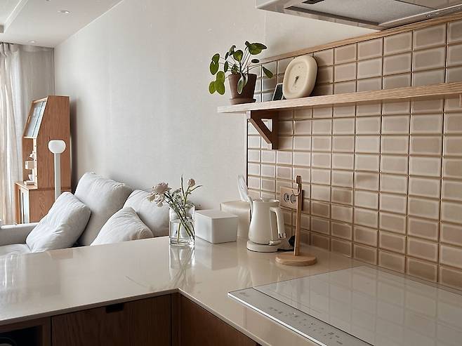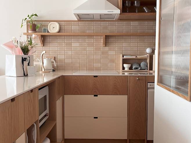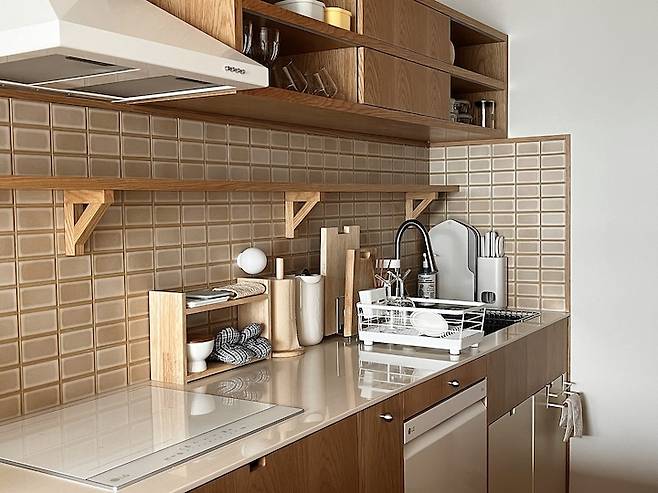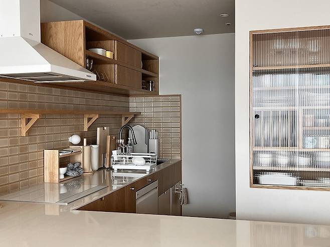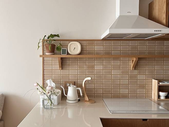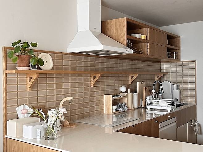 상부장과 후드 아래쪽의 선반도 저희 집 주방을 더욱 아름답게 하는 포인트 중 하나예요. 타일 시공 부분을 무늬목 테두리로 마감해서 그런지, 무늬목 선반과 그 선반의 받침마저도 조화롭게 잘 어울려요.