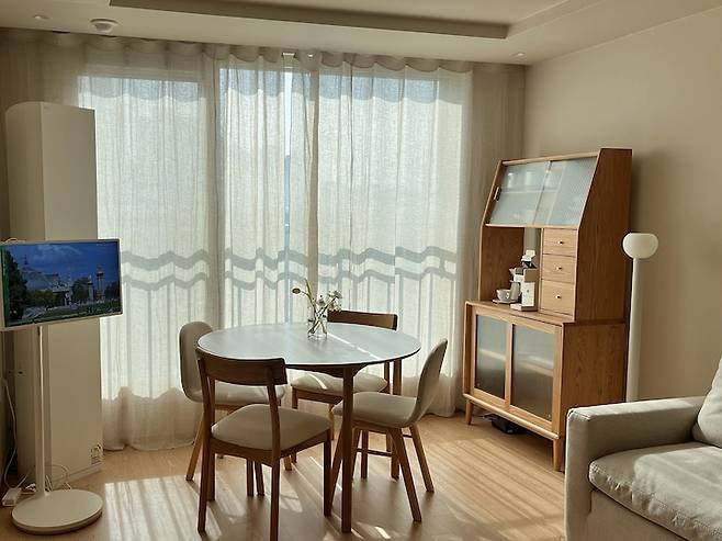 텅 비어서 허전해 보일까 걱정되기도 했지만, 오히려 벽면에 아무런 가구도 놓지 않아서 거실이 좁거나 답답해 보이지도 않고, 동선에 방해가 되는 것이 없어서 좋아요.