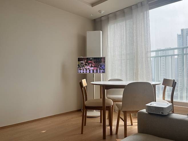 대신 큰 화면으로 영화를 보고 싶을 때가 생길 것 같아서 빔 프로젝터를 구입했고, 거실 벽면은 아트월을 제거하고 아무 가구도 놓지 않은 채 깨끗이 비워두었어요.