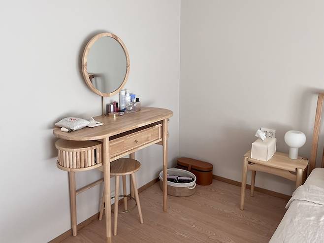 침대 옆 벽면에는 제가 사용하는 미니 화장대가 놓여 있어요. 레트로 하우스 쇼룸에 갔다가 크기며 디자인이며 한눈에 반해버려서 구매했어요.