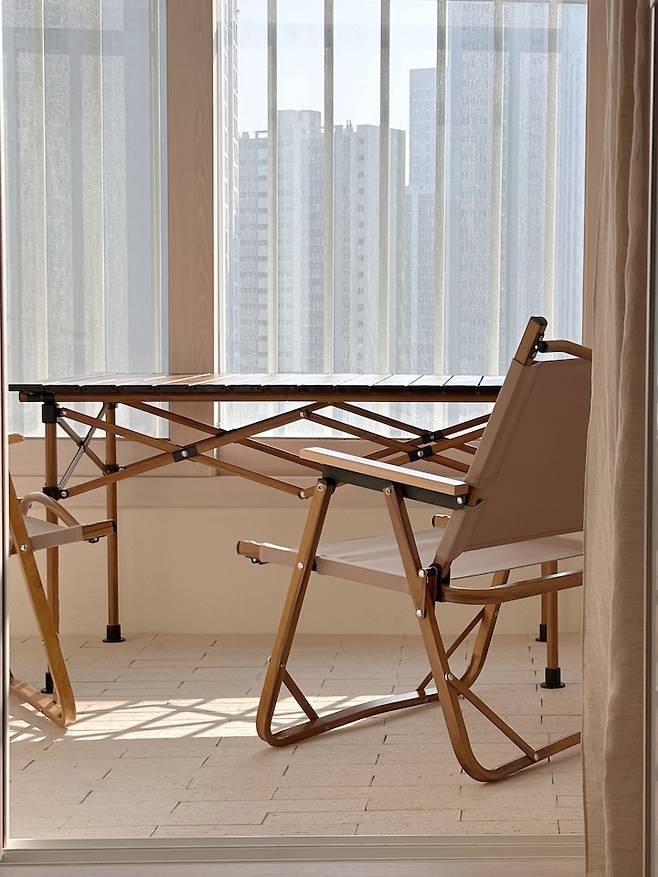 그리고 날이 좀 더 따뜻해지면 발코니에서 맛있는 것도 먹고 빔 프로젝터로 영화도 보기 위해서 섣불리 캠핑 테이블과 의자를 구비해두었답니다. 얼마 전에 빔 프로젝터를 발코니 벽 쪽에 비춰 봤는데 분위기가 너무 좋아서 벌써 기대가 돼요!