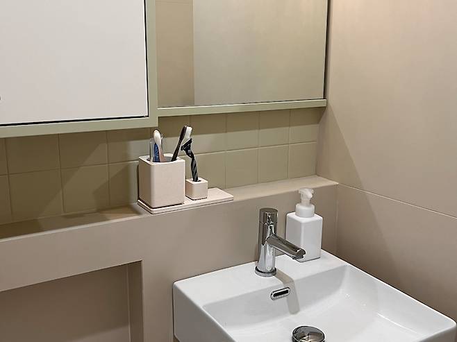 조적벽을 넣게 되면서 세면대는 조금 작은 것으로 선택해야 했는데, 양치하고 손을 씻을 때에 전혀 불편함을 느끼지 못하고 사용 중입니다. 칫솔과 면도기를 꽂아둔 규조토 꽂이는 물때 낄 걱정도 없고 보기에도 예뻐서 정말 추천해요!