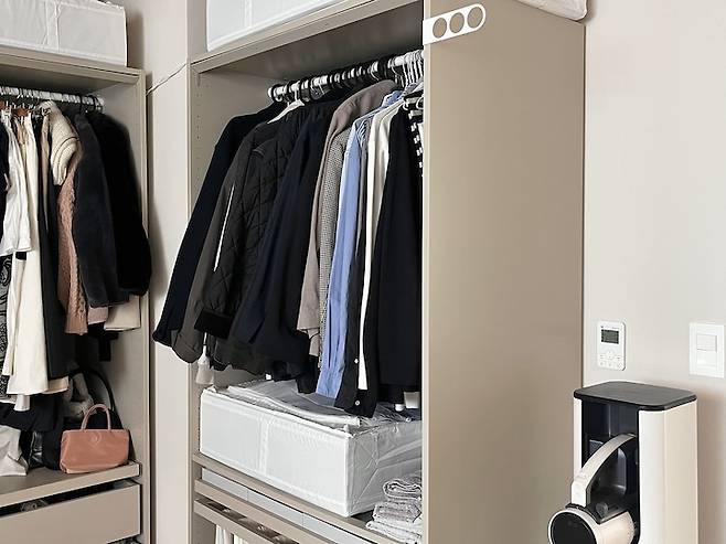 장에 문이 달려있었다면 일분일초가 아까운 출근 시간에 옷을 꺼내고 거는 데에 시간이 더 소요되었을 거예요. 하지만 문을 달지 않았기 때문에 한눈에 효율적으로 옷을 찾을 수 있어서 좋아요.