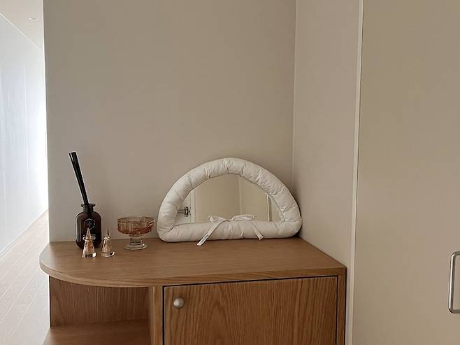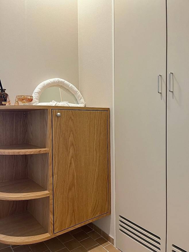 현관에 들어서자마자 보이는 모서리가 둥근 현관장은 잡동사니 수납은 물론, 각종 오브제나 액자를 두어 포인트를 줄 수도 있어 아주 유용해요. 지금은 귀여운 오브제용 거울을 두었지만, 예쁜 액자를 구매해서 놓아볼까 고민 중이에요!