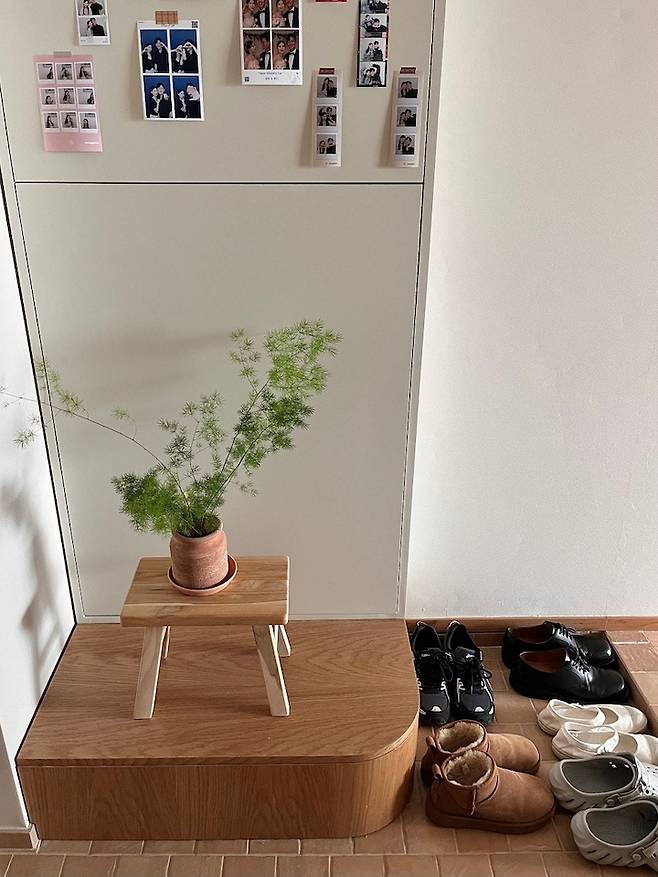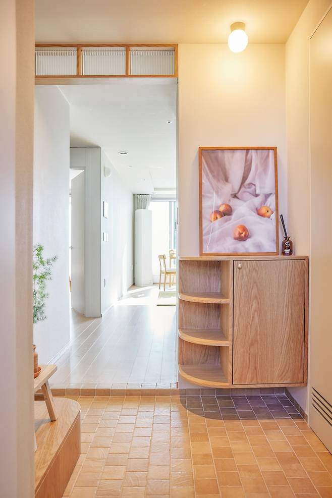 탈바꿈한 저희 집 현관 전경은 일반 휴대전화 카메라로 예쁘게 담아 내기가 너무 힘들어서, 스튜디오 에디와 협업을 많이 하고 계시는 포토 실장님의 작업본을 가져와봤습니다! 채광이 예쁘게 드는 집이라서 현관에 들어서자마자 차르르 드는 햇살이 집을 더욱 따스해 보이게 만들어주어요.