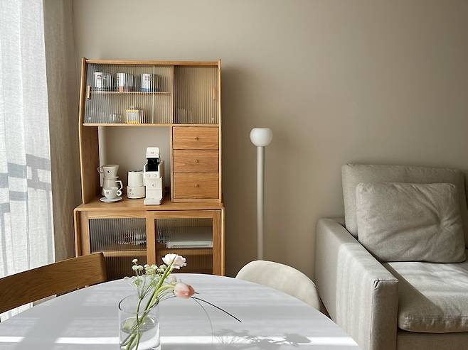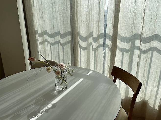 어릴 때는 잘 몰랐었는데, 이제는 꽃이 주는 아름다운 힘을 알게 되고 말았어요 :-) 커튼은 위누에서 구매한 린넨 커튼인데, 햇살을 적절히 받아내어 주면서 소재가 주는 포근한 느낌이 거실을 더 따뜻하게 보이게 만들어줘요.