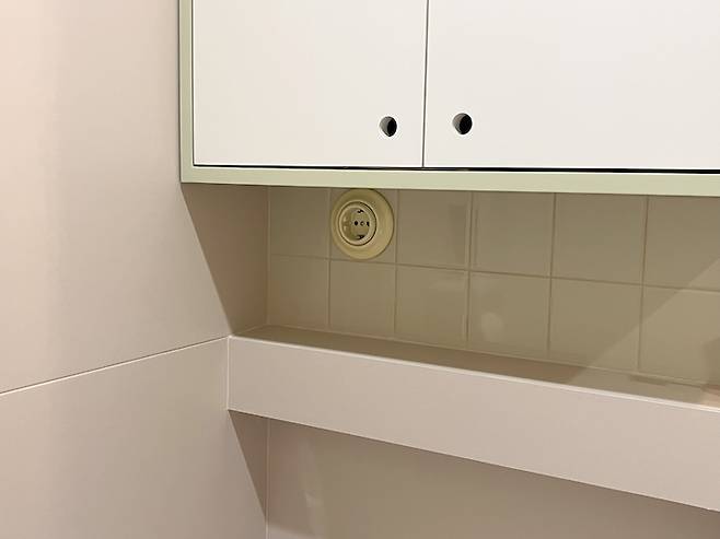 욕실 수납장 아래에 넣은 바닐라 아이스크림이 떠오르는 귀여운 세라믹 콘센트도 저희 욕실에서 빼놓을 수 없는 포인트 중 하나예요! 동글동글 너무 귀여워요♡