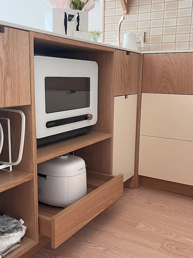 큐커는 저희가 이사를 하기 전부터 사용했어서 큐커가 쏙 들어갈 수 있게 장을 짜주셨는데, 저희 부부는 다행히 큰 밥솥이 필요 없었기 때문에 밥솥을 넣는 공간을 컴팩트하게 처리해서 큐커 넣을 공간을 충분히 확보할 수 있었어요.