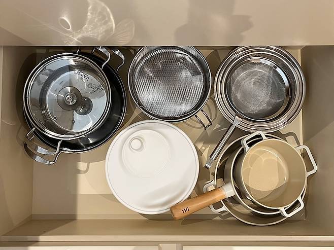 인덕션 아래쪽 서랍에는 부피가 큰 조리도구와 면기 같은 주방 용품들을 차곡차곡 보관하고 있어요. 어떤 용품들이 있는지 이렇게 한눈에 볼 수 있다는 게 서랍장의 가장 큰 장점인 것 같아요.