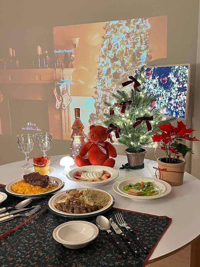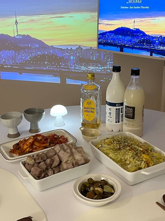벽면이 스크린 역할을 해주는 덕분에 불금과 쉬는 날에는 이렇게 시즌과 분위기에 적절한 영상과 노래를 틀어두고 맛있고 즐거운 시간을 보낼 수 있게 되었어요.