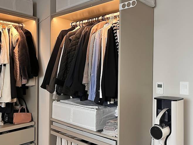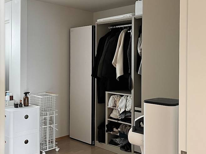 아무래도 문이 달린 장을 선택했다면 드레스룸이 좀 더 깔끔한 느낌이었겠지만, 저는 옷방이 굳이 군더더기 없이 깔끔해 보여야 할 필요는 없다고 생각했어요.