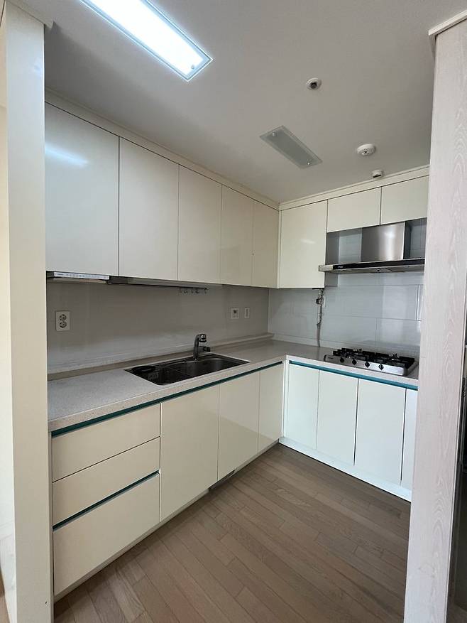 기존에 ㄱ자 형태로 좁고 폐쇄적이었던 답답한 주방의 모습이에요. 조리 공간도 턱없이 부족한 거 보이시나요?