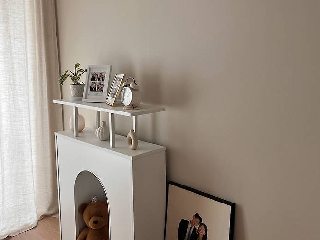 침대 아래쪽 벽면에는 이전 집에서도 사용하던 저희의 추억이 한가득 담긴 벽난로장을 두었어요.
