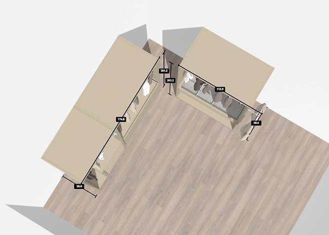 우선 전 집주인 분들이 설치해두었던 시스템장은 철거하고, 그 자리에 이케아 팍스 제품을 온라인 플래닝 프로그램을 활용해 원하는 대로 디자인해서 배치했어요.