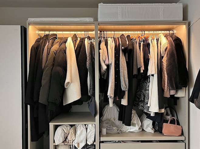 이케아에 가서 팍스 옷장을 처음 봤을 때 은은하게 설치되어 있던 라인 조명이 너무 예뻐서 함께 구성했더니 드레스룸 분위기가 한껏 사는 것 같아서 만족해요. 계절 옷은 이케아 스쿠브 수납함에 정리해두었는데 조립하기도 쉽고 가벼워서 좋고 통기성까지 갖추고 있어서 추천합니다!