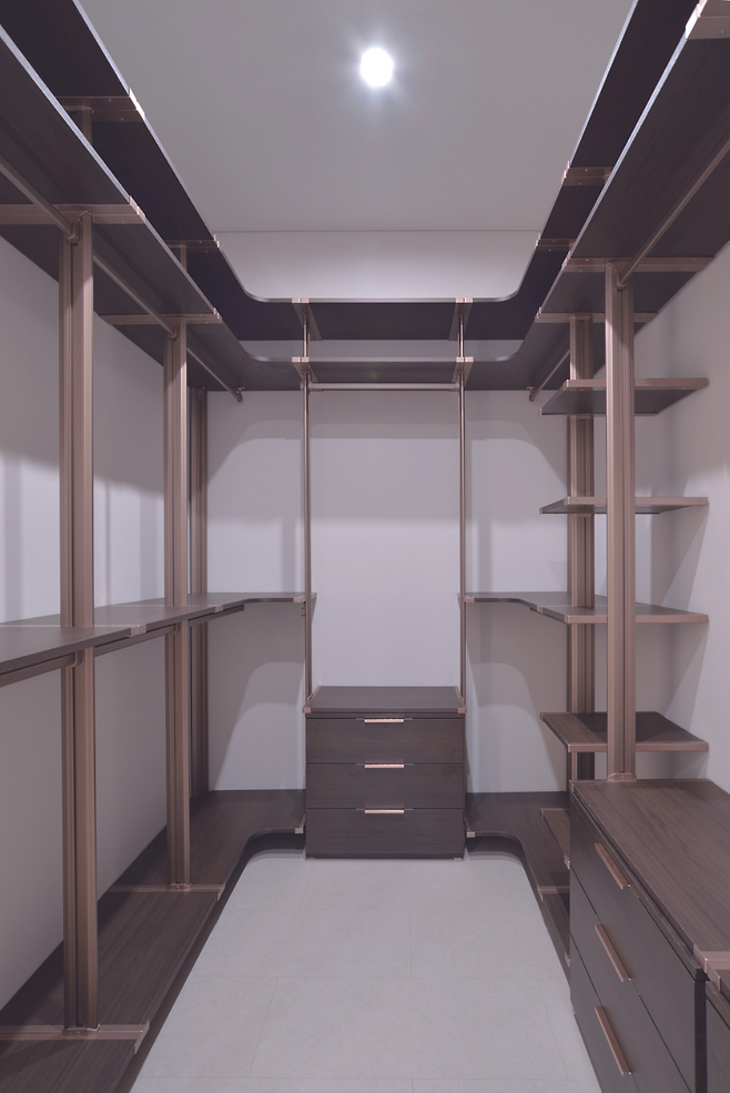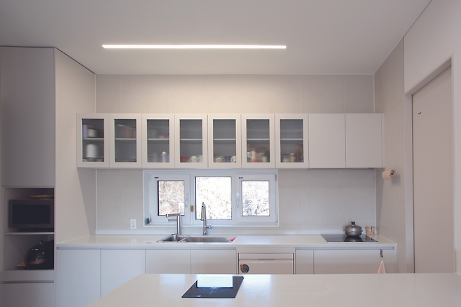 “35년 전 조립식 패널로 집을 지은 후 이번이 두 번째 집입니다. 일단 널찍한 주방을 갖고 싶었고, 다용도실과 팬트리도 주방 곁에 둬 이용하기 편하도록 동선을 계획했습니다. 또 깔끔한 주방을 위해 상하부장을 최소화하는 대신 벽 쪽으로 별도의 수납공간을 마련했습니다. 위엔 커피, 아래에는 식기를 넣어 두는데 만족도가 최고입니다.”