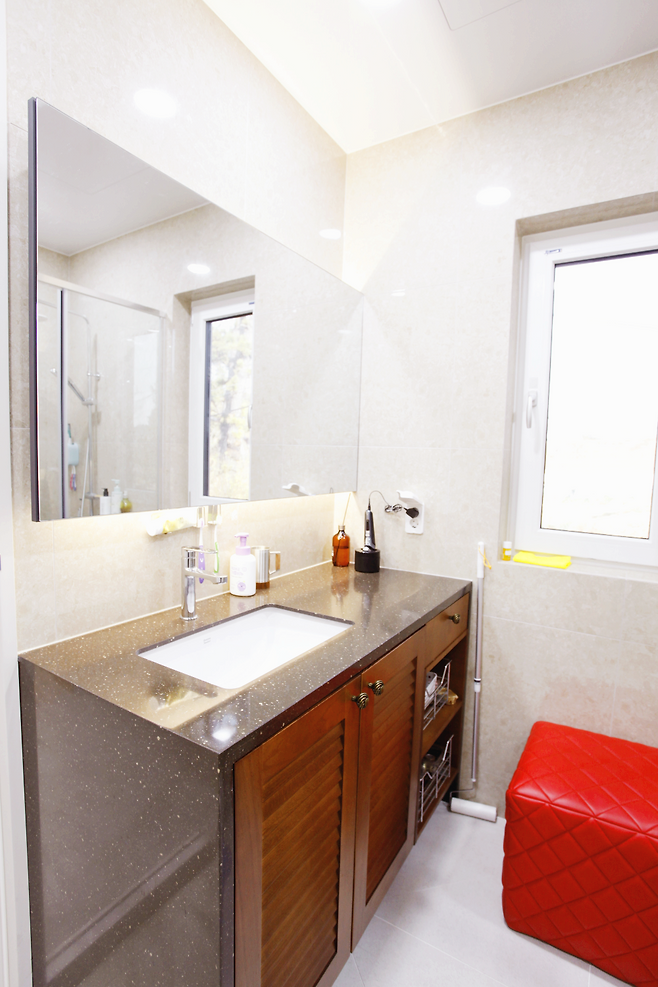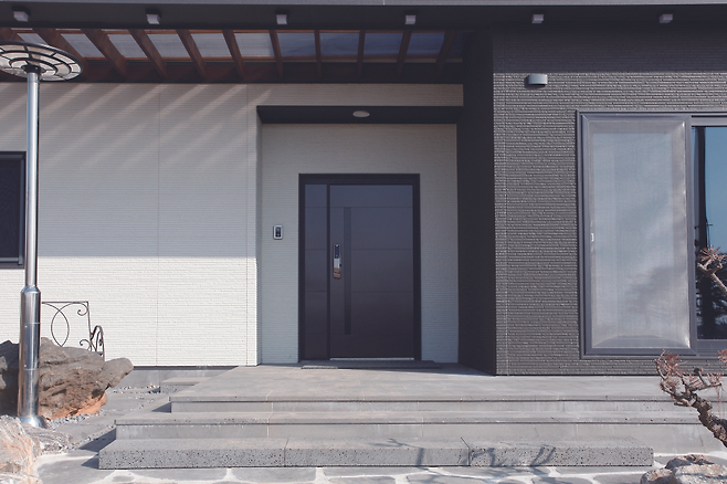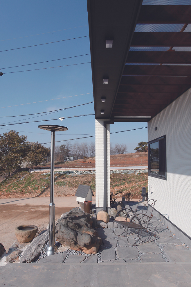 초기 설계는 30평 후반대의 연면적으로 계획됐으나, 거실과 주방 앞의 포치 공간을 내부로 통합하면서 최종적으로 45평 규모의 단층 주택으로 완성됐다. 포치는 건축주 부부가 가장 만족감을 느끼는 공간이다. 박람회 등을 열심히 다니면서 집을 지으면 어떻게 만들겠다는 구상이 이미 그려져 있었다. 폴딩 도어를 설치해 공간감을 확장했고, 바닥에는 물 빠짐이 좋은 화산석 타일을 깔았다.