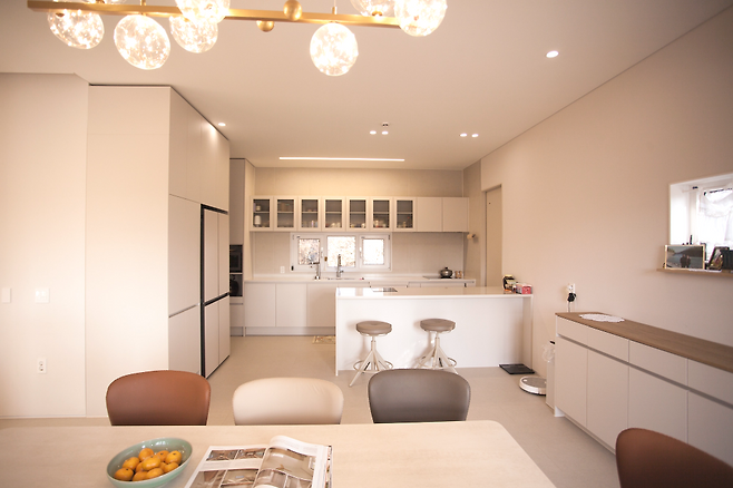 반갑게 맞아주시는 건축주 아내분을 따라 실내에 들어서니 우선 커다란 주방이 공간감을 느끼게 한다. 주부의 영역인 주방 및 다이닝 공간은 특히 아내분의 입김이 강하게 작용한 곳이다.