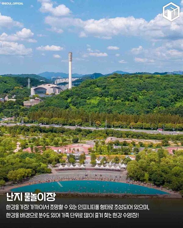 난지는 인피니티풀 구조로 한강을 바로 옆에서 감상할 수 있고, 잠실은 자연형 계류와 잔잔한 유아풀로 구성돼 있는 서울 한강 물놀이장으로 추천드립니다.