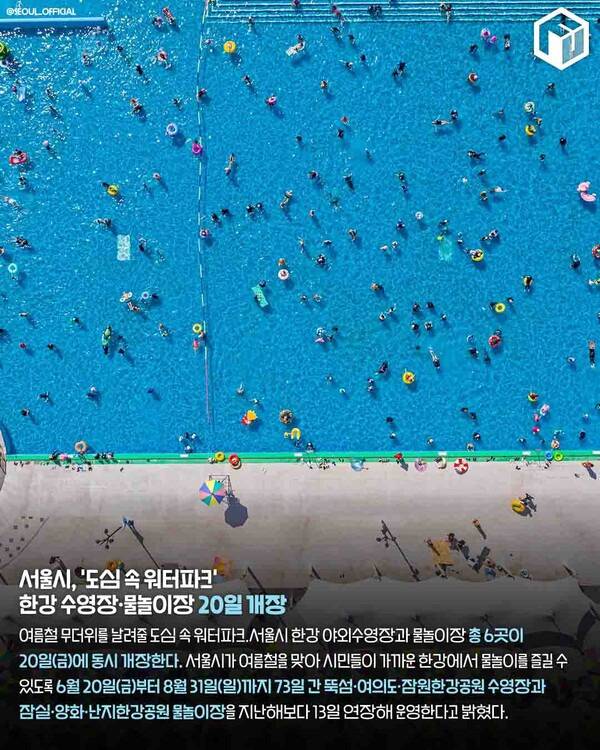 서울의 여름은 ‘한강’에서부터 시작됩니다. 2025년 여름, 서울시는 도심 속 워터파크를 콘셉트로 한 한강 수영장·물놀이장 6곳을 2025년 6월 20일(금)부터 2025년 8월 31일(일)까지 73일간 운영합니다.