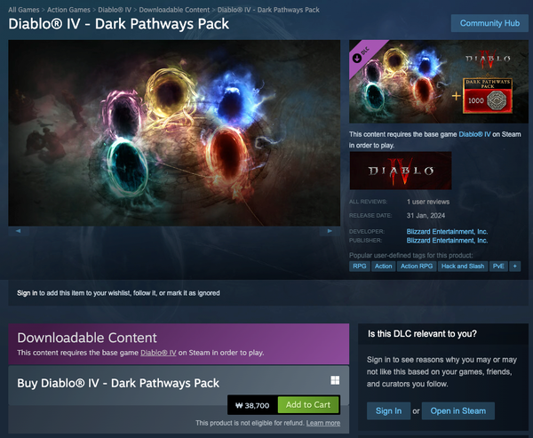 지난 13일 '디아블로4'는 새로운 DLC를 선보였습니다. 가격은 무려 3만8700원 입니다.