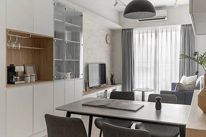 벽은 차분한 그레이블루 색상으로 마무리되어 있으며, ㄇ자 형태의 낮은 수납장이 식탁을 자연스럽게 둘러싸고 있다. 크지는 않지만, 필요시 식탁을 이동시켜 최대 여섯 명까지 앉을 수 있고, 수납장에는 다양한 컵과 차 도구, 와인잔 등이 진열되어 개인의 취향을 드러낸다.