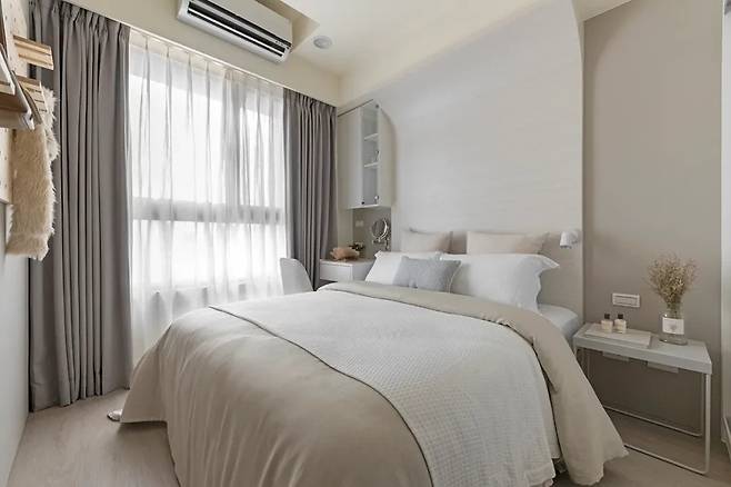 화이트 애쉬 목재를 수직으로 마감하여 따뜻한 느낌을 주고, 깊이 있는 천장의 들보는 곡선 패널로 감싸져 있어 공간의 모서리를 부드럽게 처리한다. 침대 양쪽에는 부부 각각의 취향에 맞춘 기능이 따로 마련되어 있다.