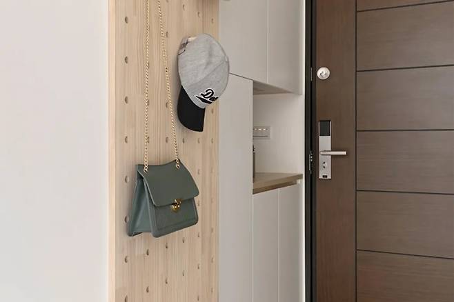 한쪽 벽면에는 가족의 신발, 헬멧, 우산 등을 수납할 수 있는 대형 신발장이 자리 잡아 입구를 깔끔하게 정리한다. 이어지는 복도는 벽 전체가 구멍이 있는 목재 패널(‘펀칭보드’라고 불림)로 되어 있어 자유롭게 후크를 걸 수 있는 구조로, 실용성과 미적 요소를 모두 충족시킨다.