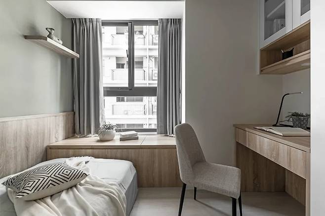 방의 크기는 2평이 채 되지 않지만, 그 제약 속에서 구조의 리듬감이 돋보인다. 창가 쪽에는 포켓형 틈새에 수납형 창턱과 좌식 침대를 설치해 아이의 휴식과 보관 기능을 동시에 충족시켰다.