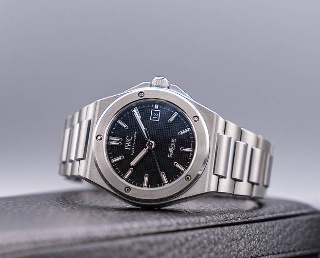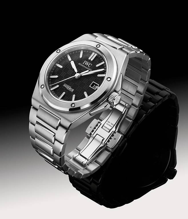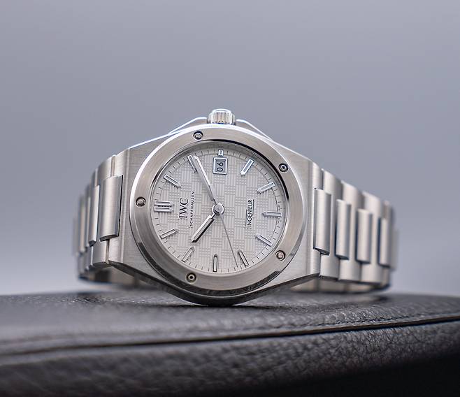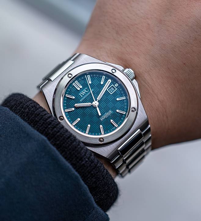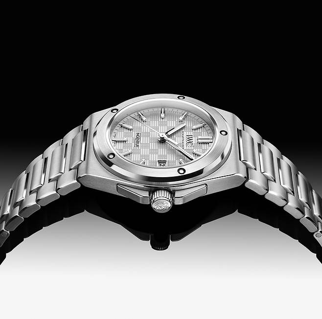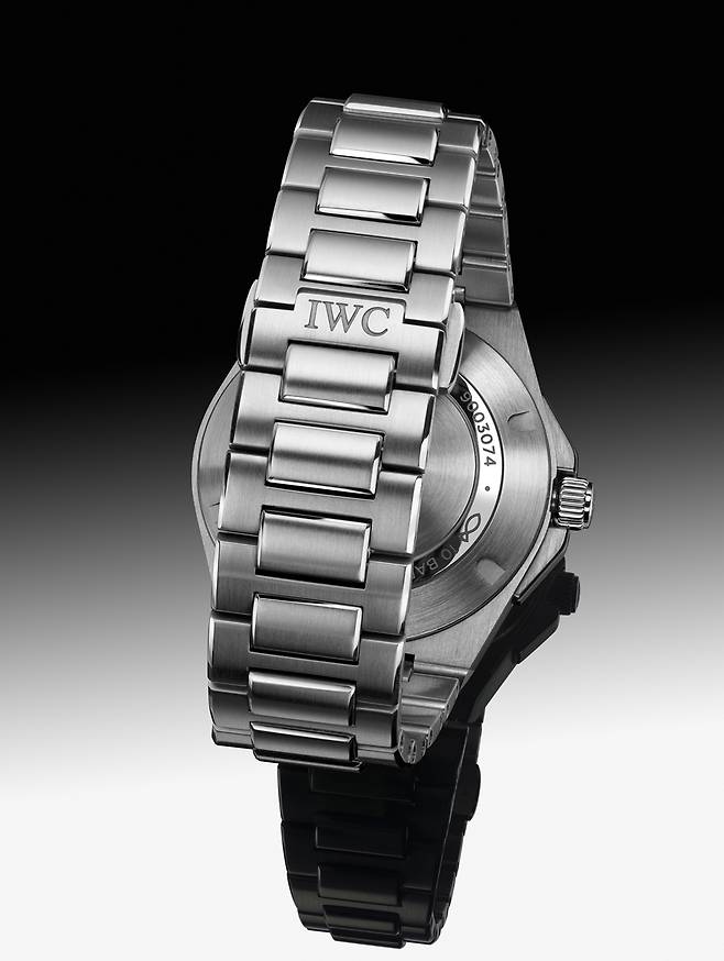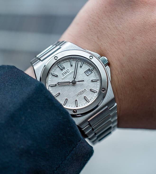 러그의 경계가 모호한 배럴형 케이스에 자연스레 이어지는 일체형 브레이슬릿은 여전합니다. 특유의 H형 링크와 직사각형 링크가 교차하는 구조입니다. 각 표면은 케이스와 동일하게 새틴 브리시드 가공을 중심으로 모서리만 폴리시드 가공하며 입체감을 살렸습니다. IWC에서 이즈X-체인지(EasX-CHANGE)로 명명한 독자적인 인터체인저블 시스템은 아쉽게도 빠졌습니다.