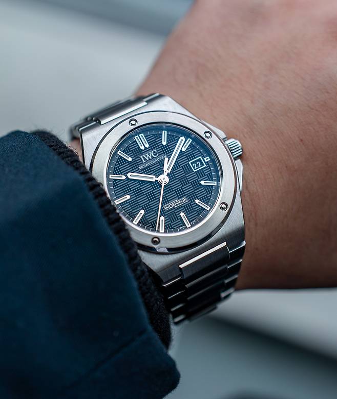 차세대 인제니어의 가장 큰 변화는 다이얼입니다. 역사적인 인제니어 SL의 격자 무늬가 다시 부활했습니다. 아연 도금으로 색을 입히기 전, 스탬핑을 통해 다이얼 표면에 입체적인 패턴을 찍는다고 합니다. 세부적인 패턴은 가는 실선 무늬와 격자 무늬가 교차합니다. 현대의 기술로 완성한 각 패턴은 역시나 오리지널보다 좀더 입체적이고 뚜렷해 보입니다. 아플리케 인덱스 및 핸즈는 오리지널과 유사합니다. 가느다란 연필 모양에 표면에는 슈퍼루미노바 야광물질을 도포했습니다. 기준점이 되는 12시 방향 인덱스는 아워 인덱스 두 개를 겹쳐 다른 인덱스와 구분했습니다. 다이얼 상단에는 IWC의 요즘 로고가, 아래쪽에는 인제니어 전통의 번개 로고가 자리해 중심을 잡습니다. 날짜 창은 오지널과 동일하게 3시 방향에 위치합니다. 창 주위로는 금속 테두리를 설치하는 등 디테일에 좀더 신경을 썼습니다.