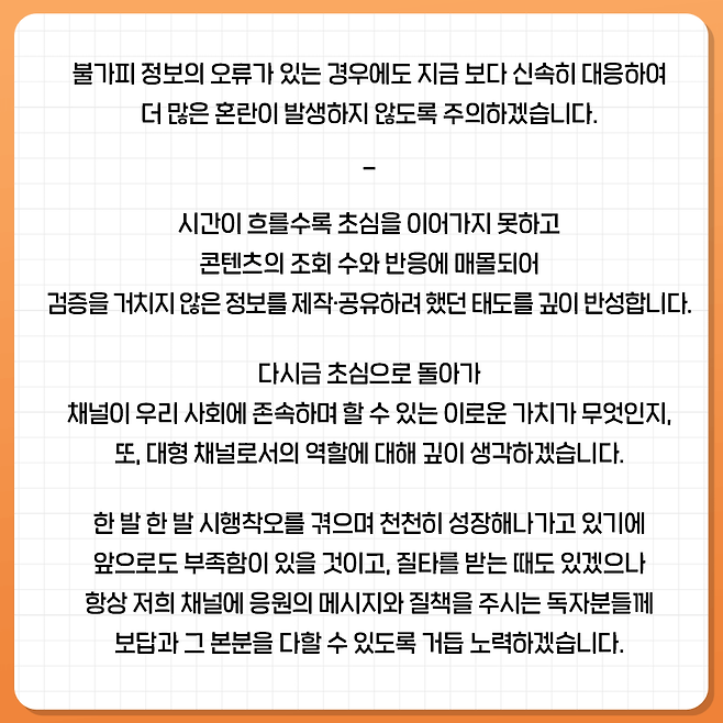 시간이 흐를수록 초심을 이어가지 못하고 콘텐츠의 조회 수와 반응에 매몰되어 검증을 거치지 않은 정보를 제작·공유하려 했던 태도를 깊이 반성합니다.