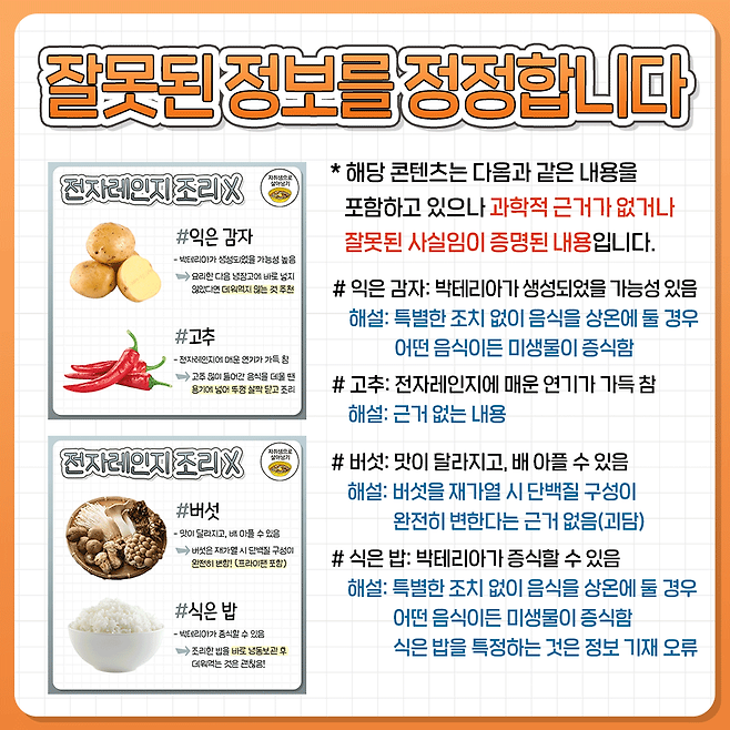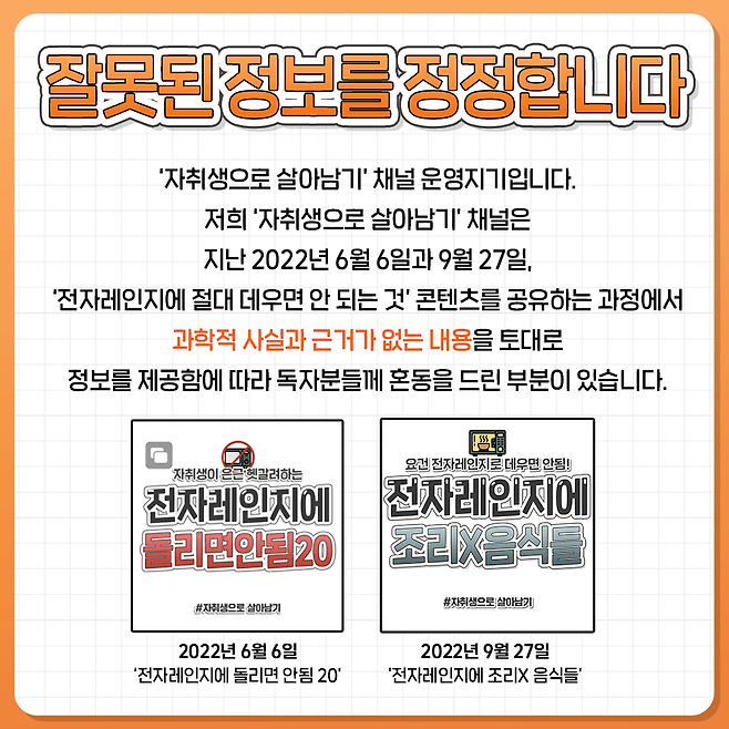 저희 ‘자취생으로 살아남기’ 채널은 지난 2022년 6월 6일과 9월 27일, ‘전자레인지에 절대 데우면 안 되는 것’ 콘텐츠를 공유하는 과정에서 과학적 사실과 근거가 없는 내용을 토대로 정보를 제공함에 따라 독자분들께 혼동을 드린 부분이 있습니다.