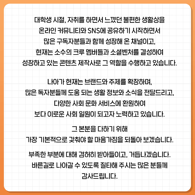 대학생 시절, 자취를 하면서 느꼈던 불편한 생활상을 온라인 커뮤니티와 SNS에 공유하기 시작하면서 많은 구독자분들과 함께 성장해 온 채널이고, 현재는 소수의 크루 멤버들과 소셜벤처를 결성하여 성장하고 있는 콘텐츠 제작사로 그 역할을 수행하고 있습니다.