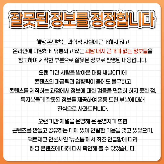 오랜 기간 채널을 운영해 온 운영지기 또한 콘텐츠를 만들고 공유하는 데에 있어 안일한 마음을 갖고 있었으며, 팩트체크 언론사인 ‘뉴스톱’에서 최초 언급함에 따라 해당 콘텐츠에 대해 다시 확인해 볼 수 있었습니다.