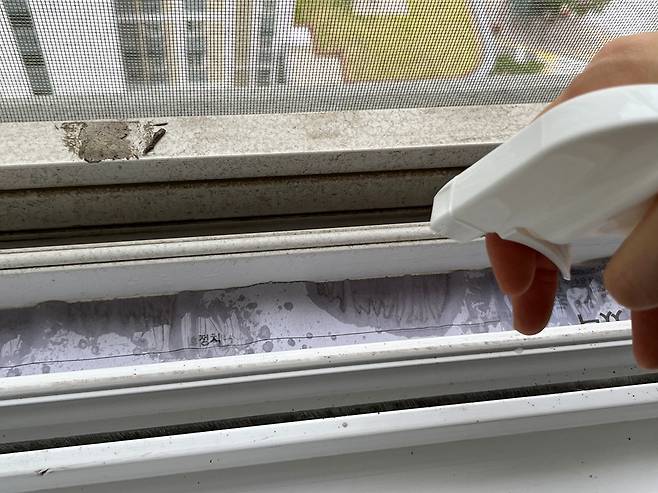 창틀에 오랜 시간 쌓인 먼지가 많은 경우 신문지와 분무기를 활용해 보세요. 신문지를 창틀 모양에 맞게 자른 후 덮어 주세요. 그 위에 분무기로 물을 뿌립니다.