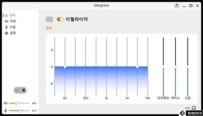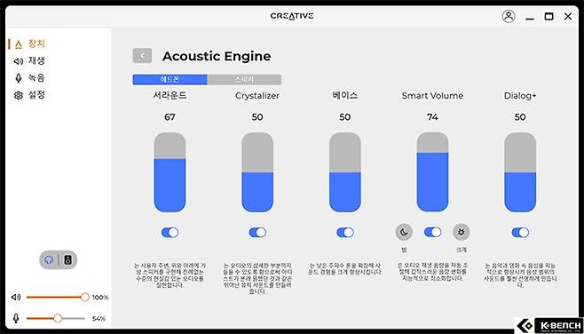 크리에이티브 앱에서 어쿠스틱 엔진 항목에 들어가면 서라운드 효과나 크리스탈라이저 같은 다양한 음장 효과를 적용할 수 있고 베이스 강도나 시간에 따른 볼륨 자동 조절, 음성만 강조 하는 기능 등을 사용할 수 있다.