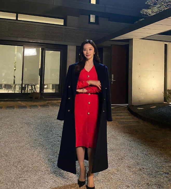또 다른 드레스룩에서는 빨간 버튼 디테일 원피스와 블랙 코트를 매치해 세련된 겨울룩을 선보이며 시선을 사로잡았습니다.