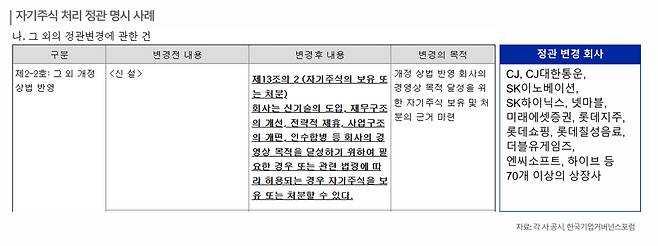 이에 이번 주총에서도 정관을 추가한 사례가 잇따랐다. 발표자료에 따르면 △CJ △CJ대한통운 △SK이노베이션 △SK하이닉스 △넷마블 △미래에셋증권 △롯데지주 △롯데쇼핑 △롯데칠성음료 △더블유게임즈 △엔씨소프트 △하이브 등 70개 이상의 상장사가 관련 조항을 정관에 반영했다.