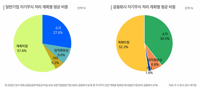 발표자료에 따르면 한신평에서 투자등급 이상의 유효 신용등급을 갖고 있으면서 자사주 관련 계획을 발표한 일반기업 87곳과 금융회사 27곳 가운데 처리계획이 미정인 자사주 비율은 일반기업 57.6%, 금융회사 52.3%로 집계됐다.