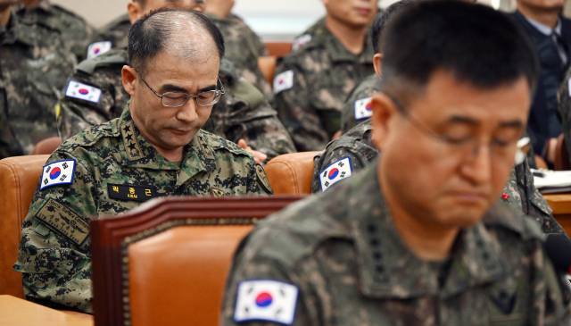 곽종근(왼쪽) 특전사령관이 10일 국회에서 열린 국방위원회 전체회의에 출석해 박범계 더불어민주당 의원의 윤석열 대통령과 두 차례 통화 여부에 관한 질의에 답변을 망설이다가 통화 사실을 인정한 뒤 자리로 돌아가 고개를 숙이고 있다.