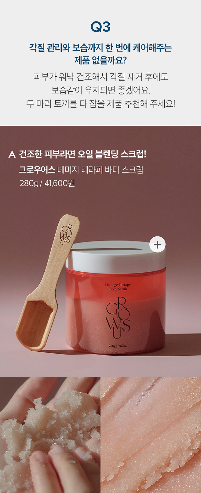 그로우어스의 데미지 테라피 바디 스크럽은 4가지의 식물성 오일이 함유되어 스크럽 후에도 피부를 건조하지 않게 유지해 주죠. 분리된 스크럽과 오일층을 잘 믹스해 사용해 주면 되는데요. 특별히 보습을 신경 써줘야 하는 팔꿈치나 발뒤꿈치 각질을 깔끔하게 케어하기에 좋아요. 오일 성분이 보습막을 만들어 주어 타올 드라이 후에도 피부를 건조하지 않게 유지해주죠. 마무리감은 미끈거림 없이 쫀쫀해서 여름엔 별도의 바디 크림을 바르지 않아도 될 정도!