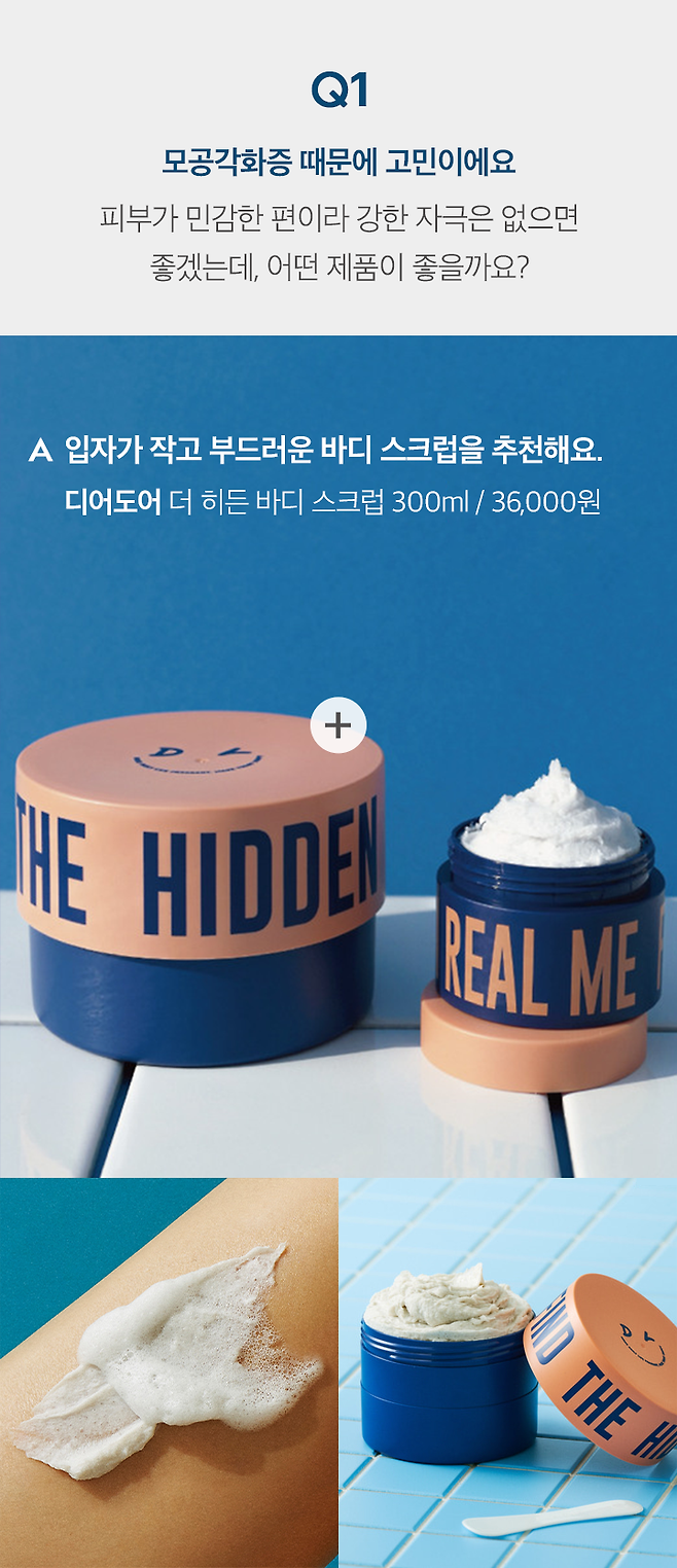 모공각화증이나 인그로운 헤어는 자극 없이 꾸준히 관리해 주는 것이 특히 중요한데요. 디어도어의 더 히든 바디 스크럽은 시중에 출시된 제품들보다 강도가 세지 않아 민감 피부도 안심하고 사용할 수 있죠. 물과 만나면 풍성한 거품이 생기는 버블 타입으로 더욱 부드럽게 사용이 가능해요. 안데스 트레살 솔트와 미세한 화산석 입자로 구성된 스크럽이 각질과 모공까지 말끔하게 클렌징해주어서 사용 후 맨들맨들해진 피부결을 확인할 수 있어요. 비건 인증까지 받은 제품이라 피부 자극 걱정에 바디 스크럽을 사용할 엄두가 나지 않았던 분들께 입문용으로도 딱이에요.