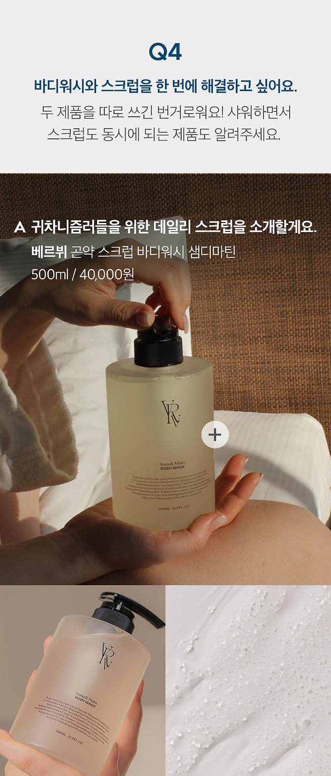 보통 스크럽은 피부에 자극을 줄 수 있어 일주일에 1-2회 사용을 추천하는데요. 바디워시가 결합된 제품은 스크럽 입자의 개수가 적고 사용감도 부드러워서 데일리로도 사용이 가능해요. 베르뷔의 스크럽 바디워시 제품은 독특하게도 각질과 노폐물을 흡착해 탈락시키는 곤약 성분의 스크럽이 함유되어 있어, 피부를 긁어내지 않아 부드럽게 사용할 수 있죠. 풍성한 거품과 싱그러운 라벤더 향기로 샤워 시간 동안 힐링까지 가능한 제품이에요.