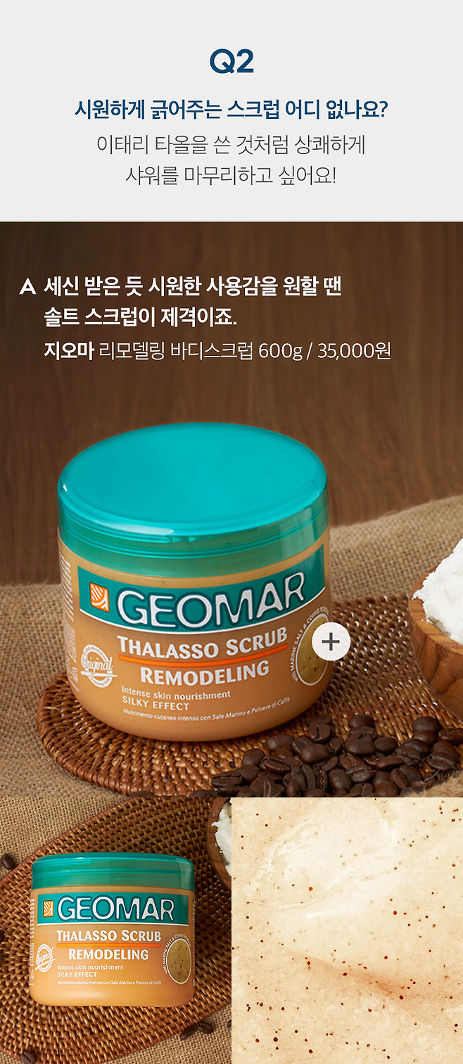 지오마의 리모델링 바디스크럽은 씨솔트와 사해소금 성분의 스크럽이 극강의 개운함을 선사해 주는데요. 크고 굵은 스크럽 입자가 닿는 곳마다 시원하게 긁어주면서 묵은 각질을 제거해 주죠. 입자가 큰 탓에 거칠진 않을까 걱정될 수 있겠지만 사용 횟수와 강도를 잘 조절해 사용해 주면 자극 걱정 없이 바디 피부를 매끄럽게 케어할 수 있어요. 샤워 후엔 아기 피부처럼 부드러워진 피부를 만나볼 수 있을 거예요. 다만 상처가 있는 부위에 소금 성분이 닿으면 따가울 수 있으니 조심!