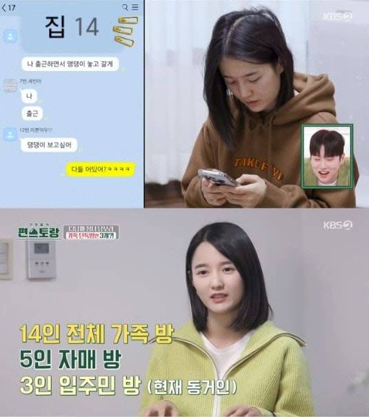 이날 남보라는 일어나자마자 단톡방 확인에 나섰는데 남보라는 들어가 있는 가족 단톡방이 3개라며 “하나는 가족 전체 14인 단톡방, 하나는 5자매 단톡방, 하나는 같이 사는 입주민 방이다. 메시지하기도 바쁘다. 한번 열면 100개, 200개가 쌓여있다”고 말했습니다.