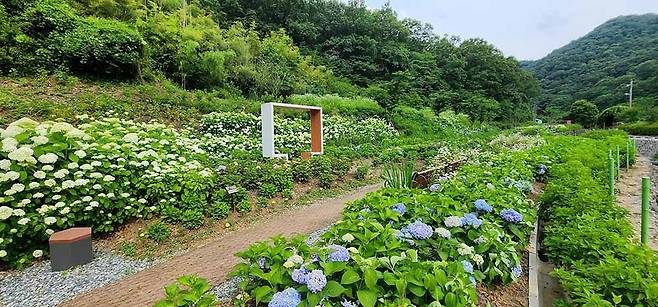 수국, 산수국, 나무수국 등 총 15개 품종의 수국을 만날 수 있으며 계곡과 숲길 사이로 이어진 산책로는 남녀노소 누구에게나 부담 없는 힐링 코스로 주목받고 있다.
